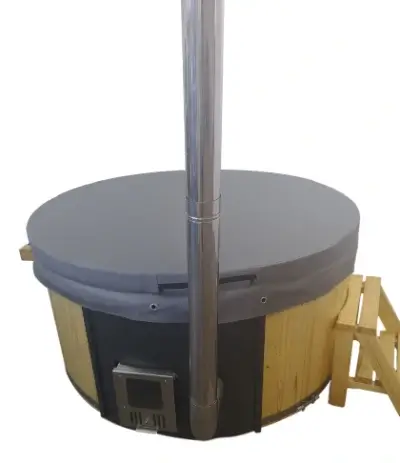 Piec zintegrowany: Wbudowany w balię, oszczędza miejsce w ogrodzie i szybko nagrzewa wodę.