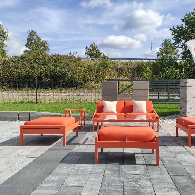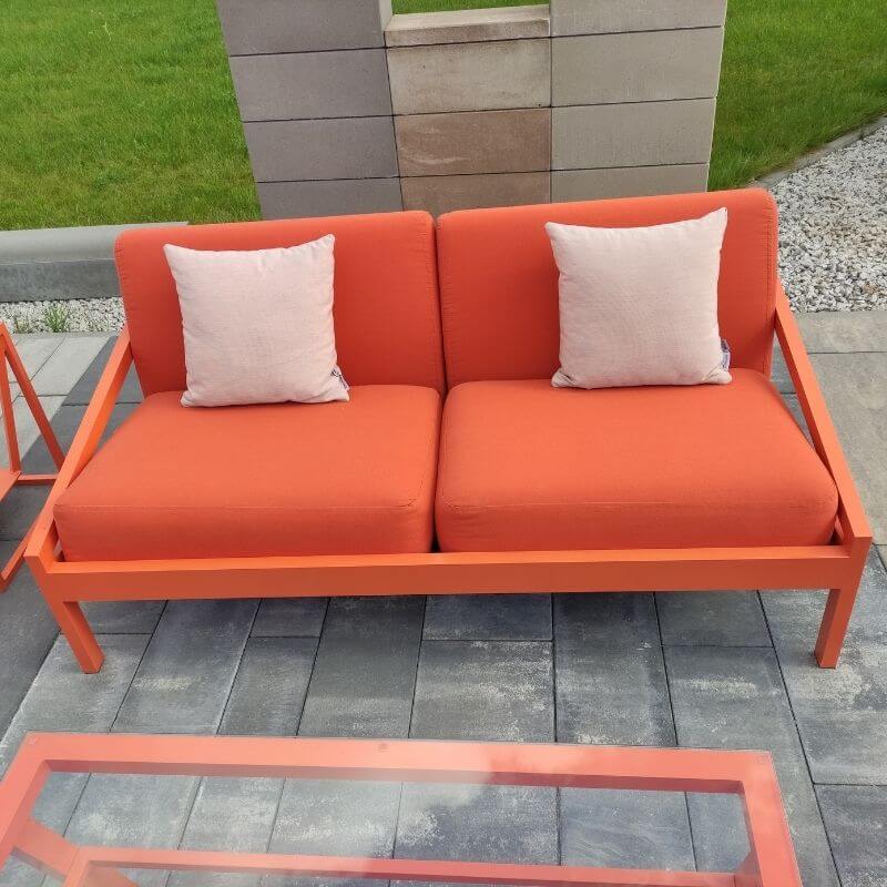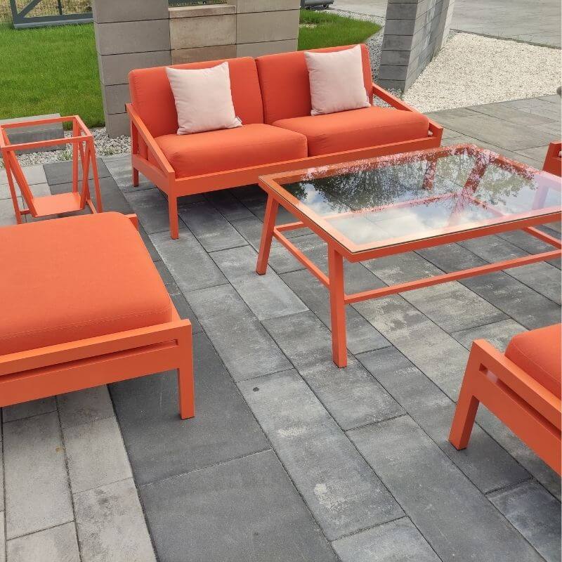 Zastaw składający się z sofy, fotela, podnóżków dużych (2 szt.), podnóżka małego, stolika oraz poduszek dekoracyjnych.