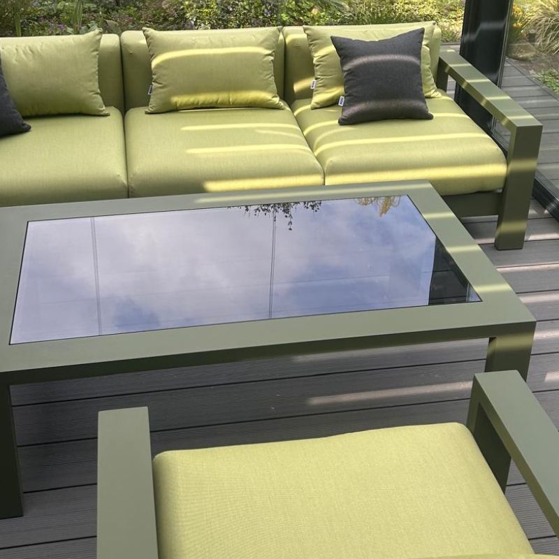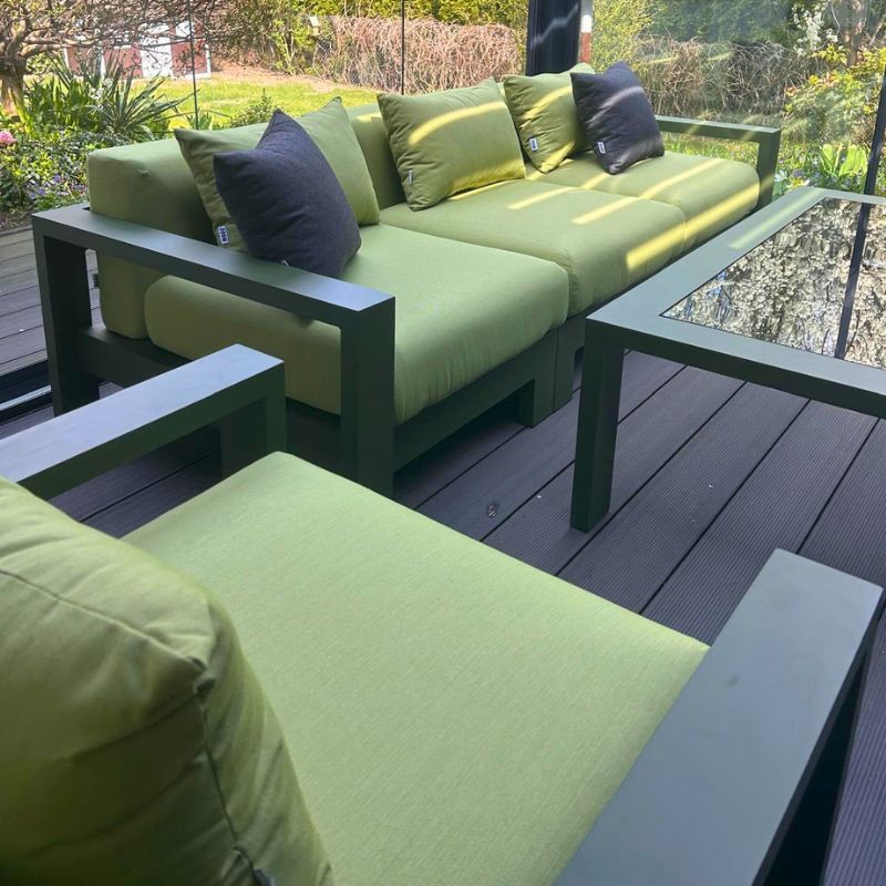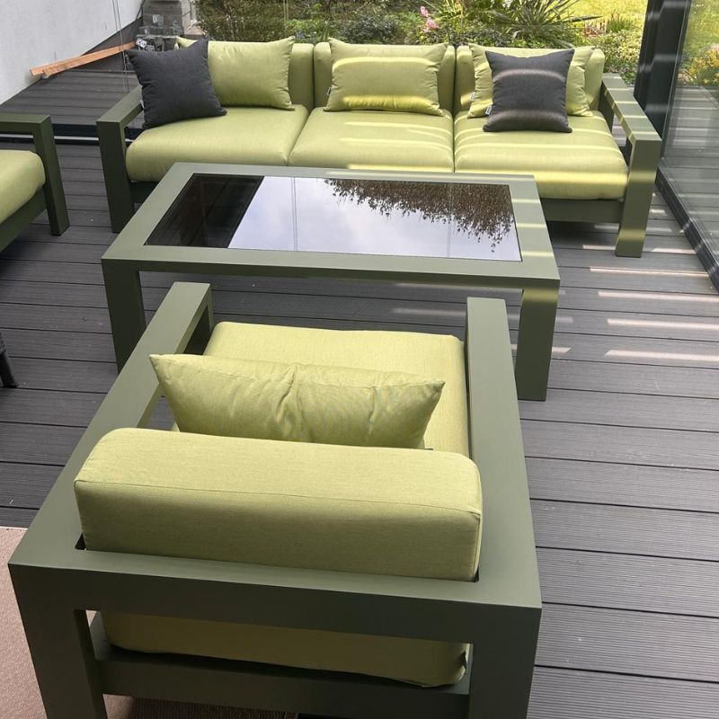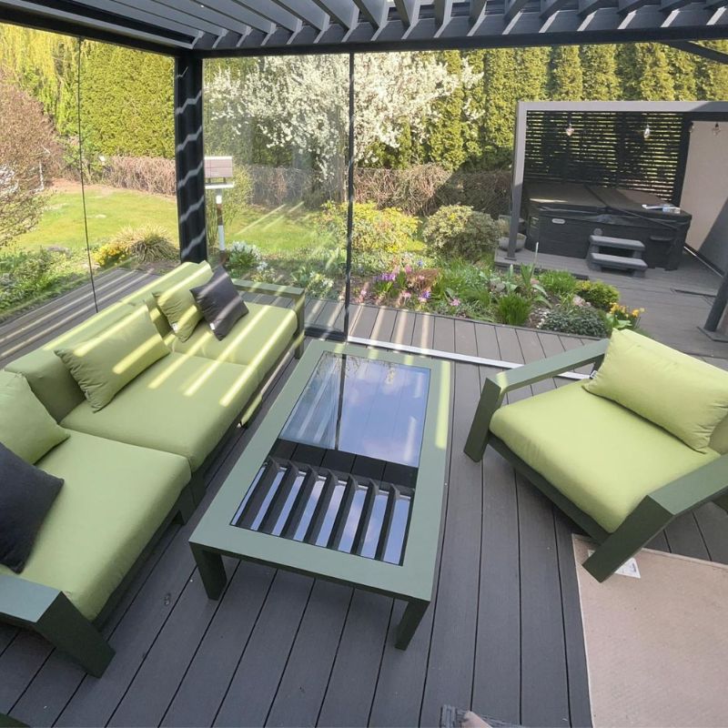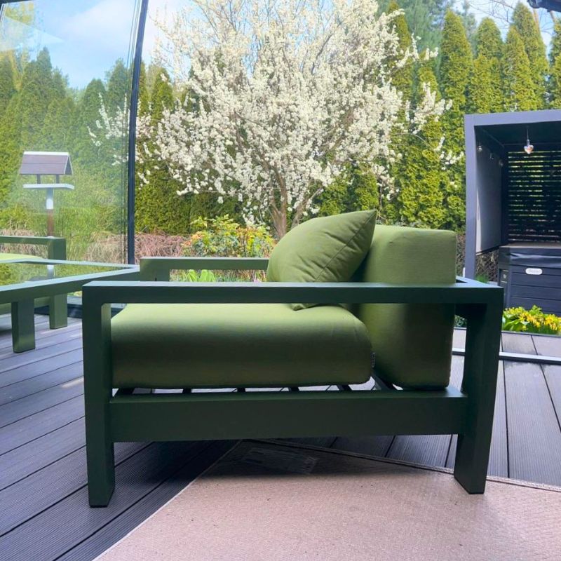 Solidna konstrukcja wykonana z aluminium gwarantuje doskonałą równowagę między lekkością a wytrzymałością. Zielone wykończenie w połączeniu z tkaniną Sunbrella Solids Lichen tworzy harmonijną, naturalną kompozycję, idealnie wpisującą się w przestrzeń ogrodu, tarasu czy patio. Aluminium jest materiałem odpornym na korozję, wilgoć oraz zmienne warunki atmosferyczne, dzięki czemu meble zachowują swój perfekcyjny wygląd niezależnie od pory roku.