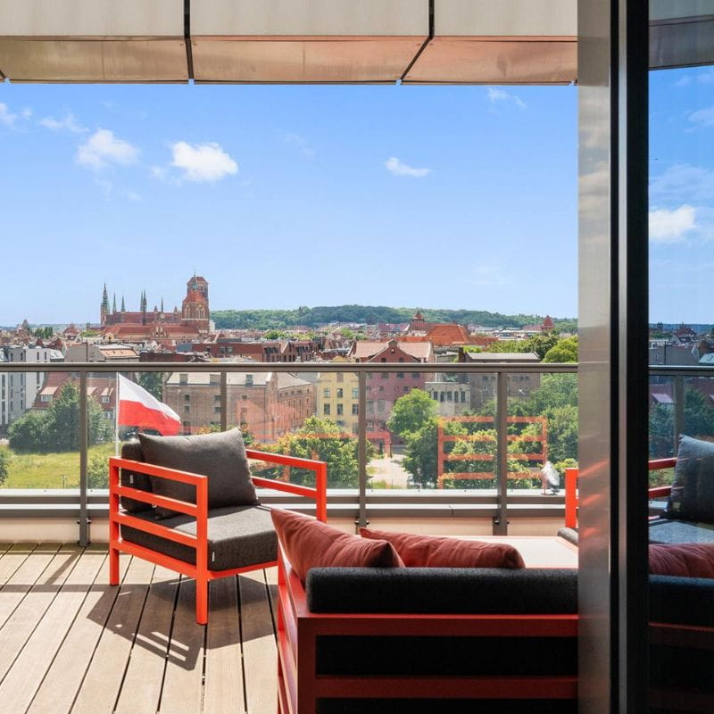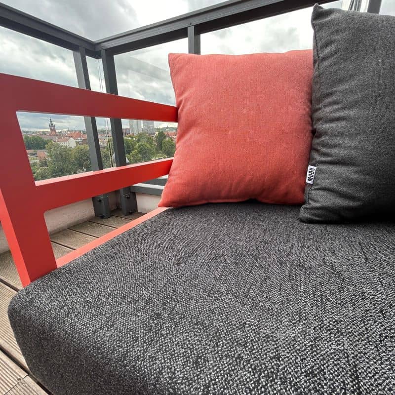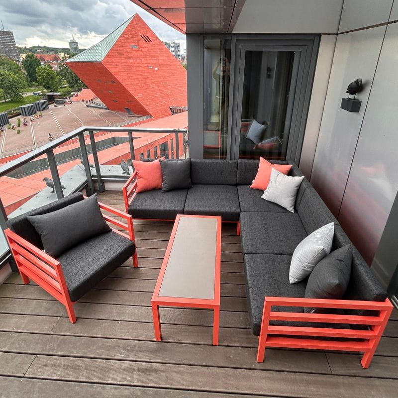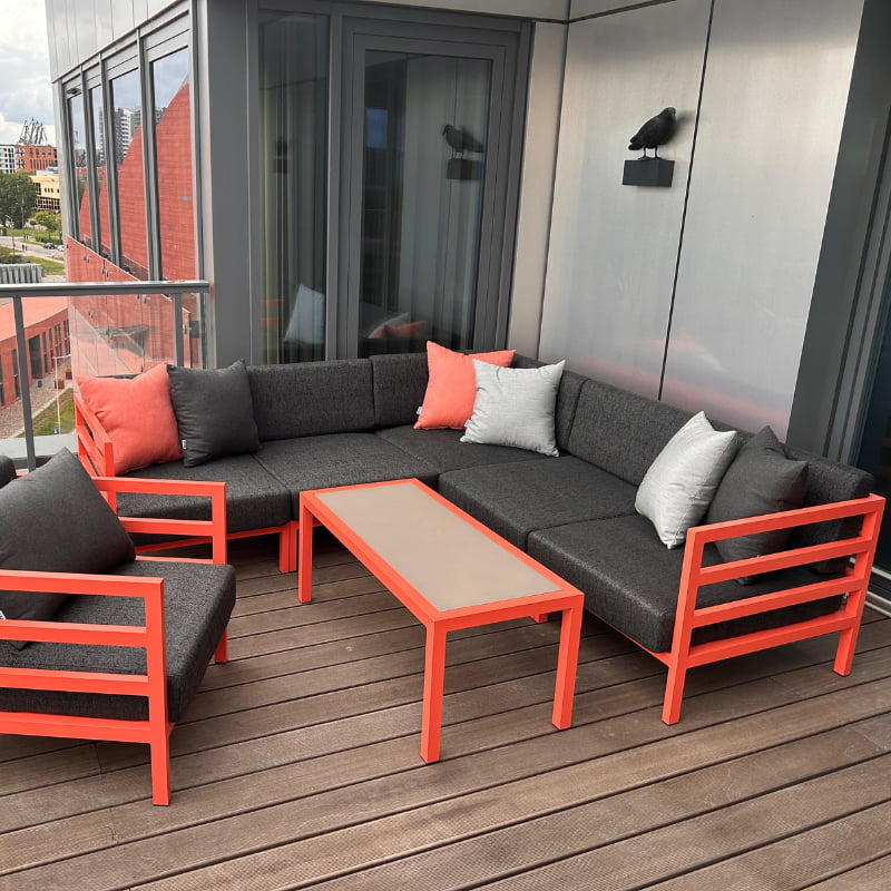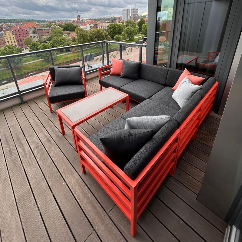 Zestaw wyróżnia się odważnym charakterem – konstrukcja została pomalowana w wyrazistym kolorze RAL 212 Salmon Orange, który doskonale komponuje się z pomarańczową elewacją budynku widocznego z tarasu. To harmonijne połączenie kolorów sprawia, że przestrzeń nabiera unikalnego, designerskiego charakteru.