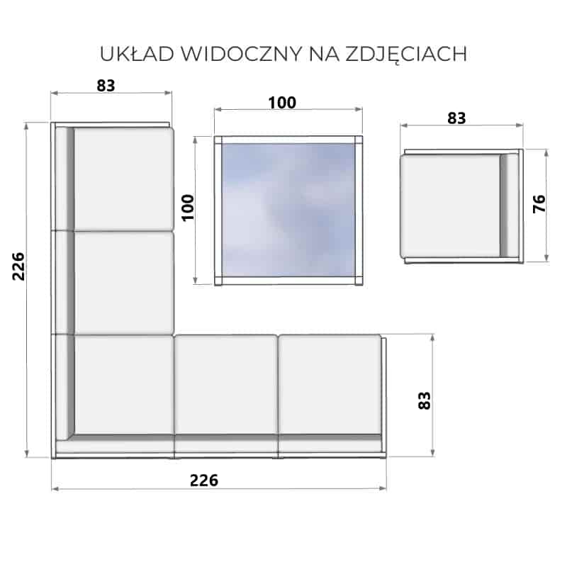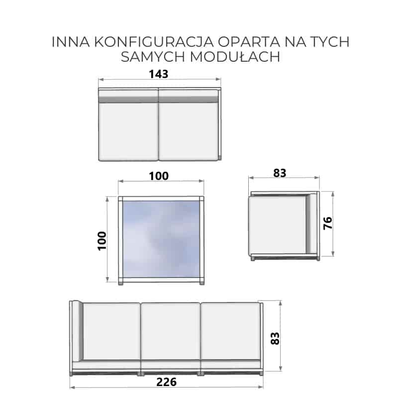 Zestaw ten, zaprojektowany z myślą o wygodzie i stylu, pomieści od 7 do 8 osób, idealnie komponując się z każdym otoczeniem. Składa się z narożnika oraz modułu wewnętrznego, który pełni funkcję komfortowego fotela. Dodatkowo, możesz dopasować do niego stolik z dowolnym blatem - wybierz spośród spieku kwarcowego lub szkła hartowanego, by stworzyć przestrzeń idealną do spotkań czy relaksu.