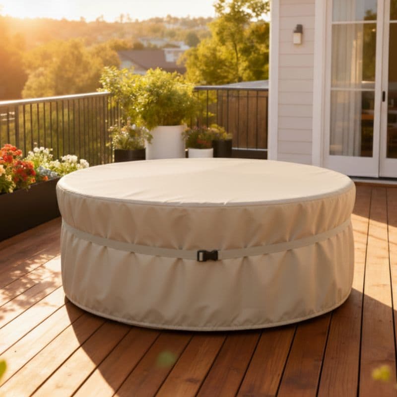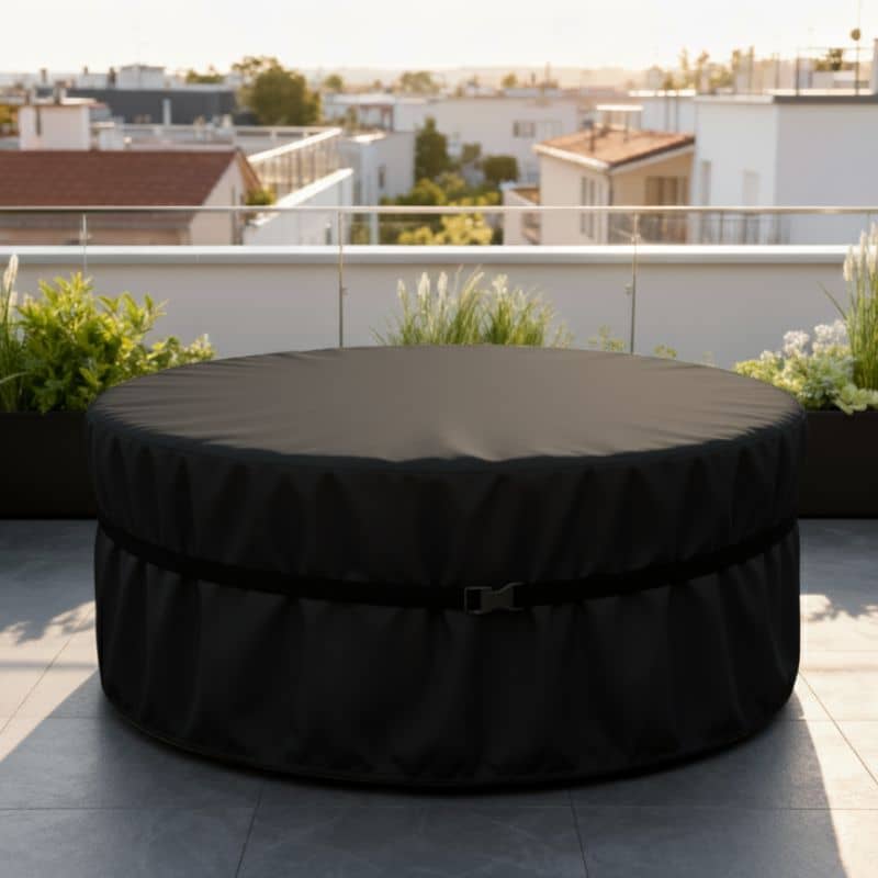Pokrowiec idealnie dopasowuje się do okrągłych mebli ogrodowych, chroniąc je przed zmienną pogodą i codziennym użytkowaniem.