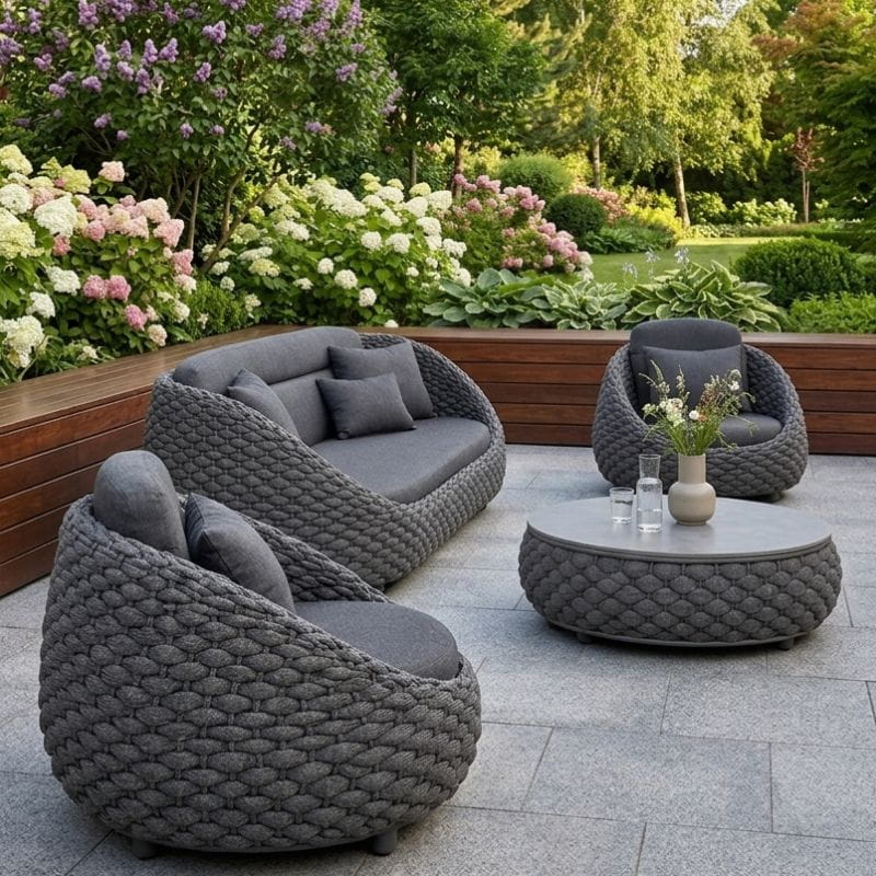 Lekkość i trwałość: Konstrukcja opiera się na aluminiowych stelażach. Meble nie rdzewieją i są łatwe w przestawianiu, co pozwala na dowolną aranżację tarasu.